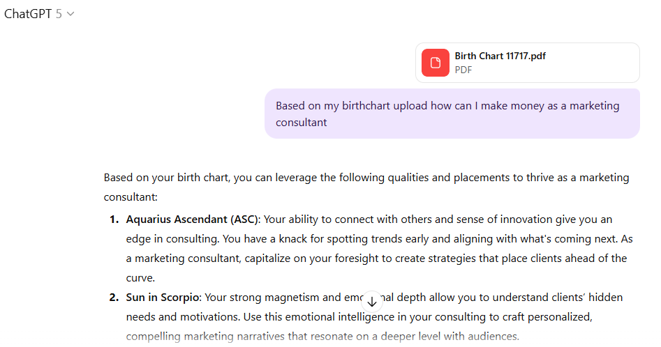 By inputting your birth chart data, you can ask ChatGPT to break down the astrological influences that might affect your financial decisions. This tool can provide practical advice on how your placements might translate into business ideas, side hustles, or even specific industries to explore.