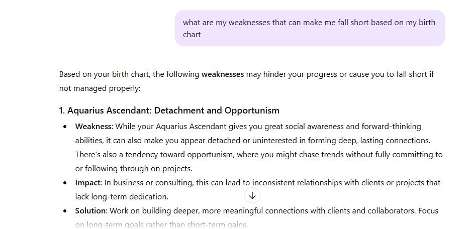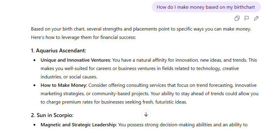 While a professional astrologer is always a good option, you can use ChatGPT to quickly explore aspects of your birth chart related to wealth and career. Here’s how you can interact with ChatGPT for this purpose:
